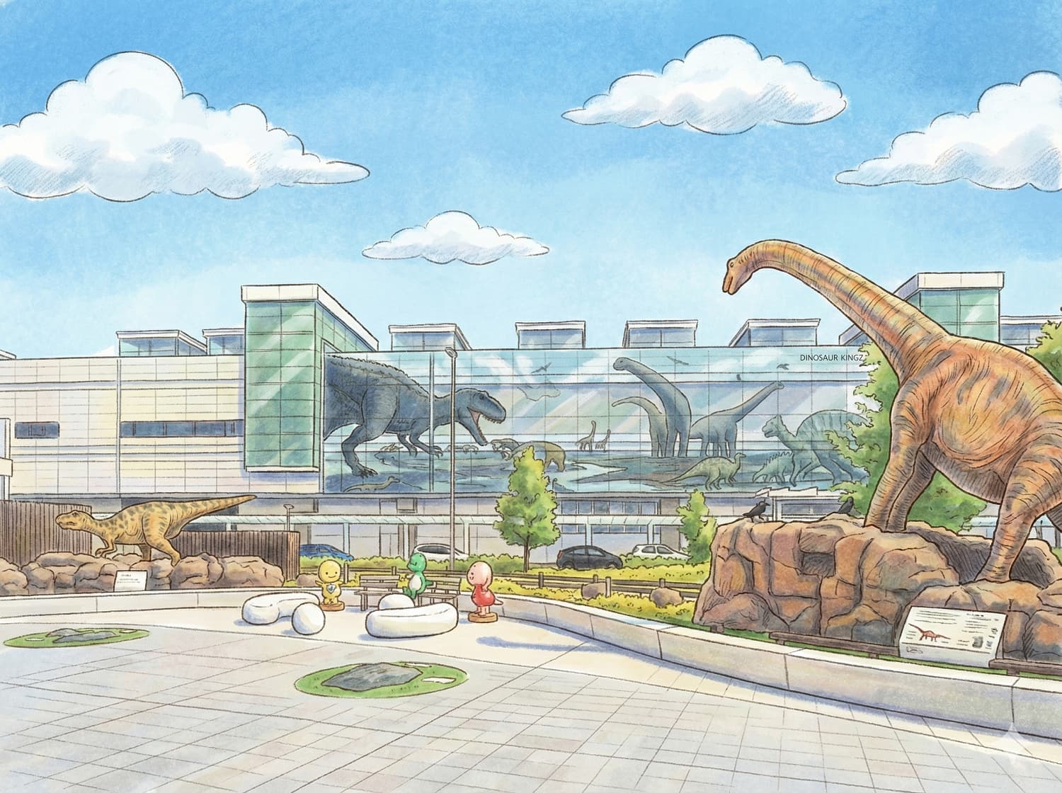 巨大な恐竜ロボットがお出迎えするロビーと、キッズスペース「きょうりゅうらんど」。