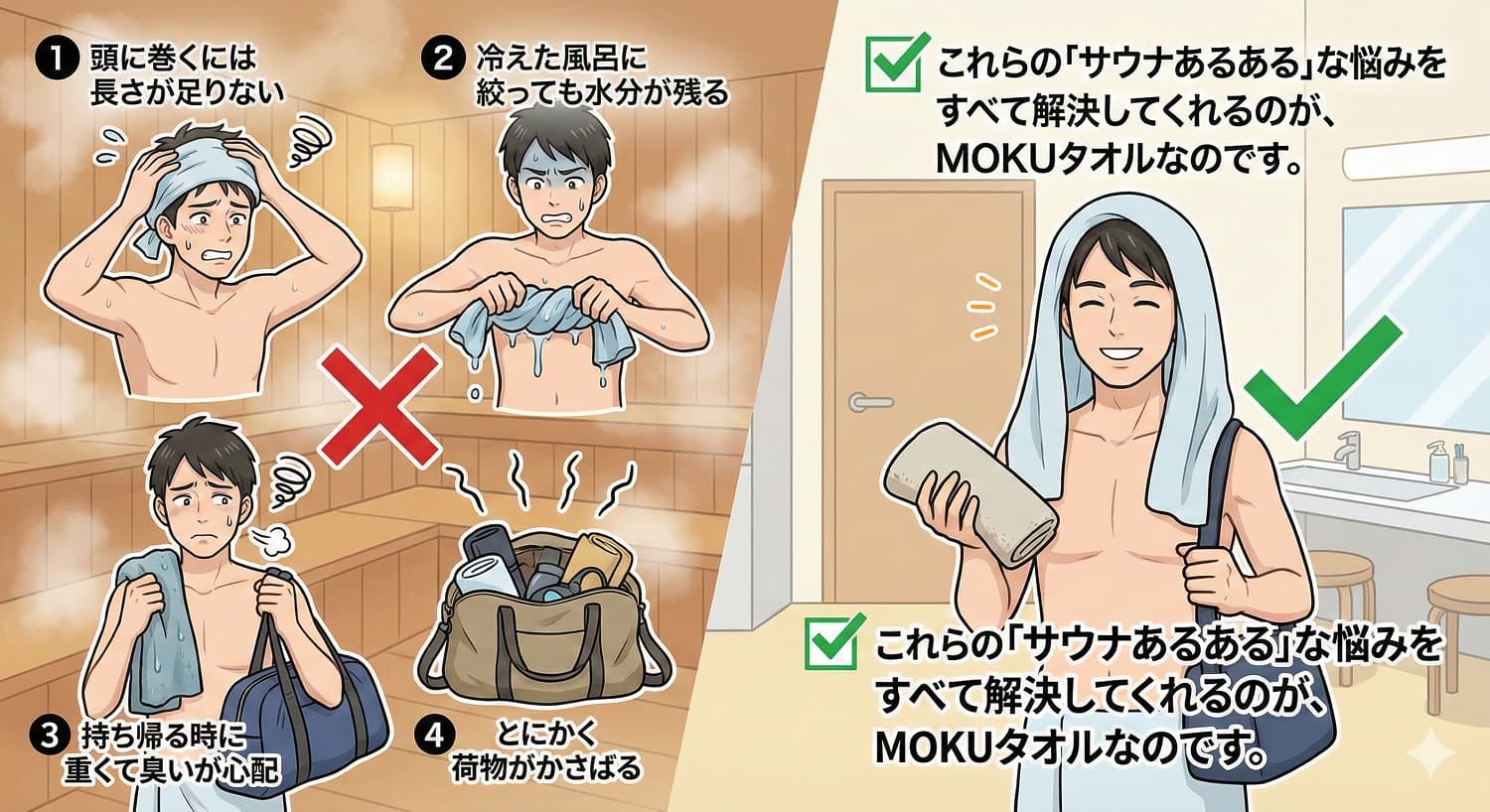 実は、これらの「サウナあるある」な悩みをすべて解決してくれるのが、MOKUタオルなのです。